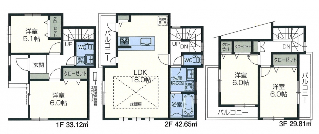 3階建て4LDKのゆったりとした間取り。水回りがリビング階に集中設計なのも魅力です。