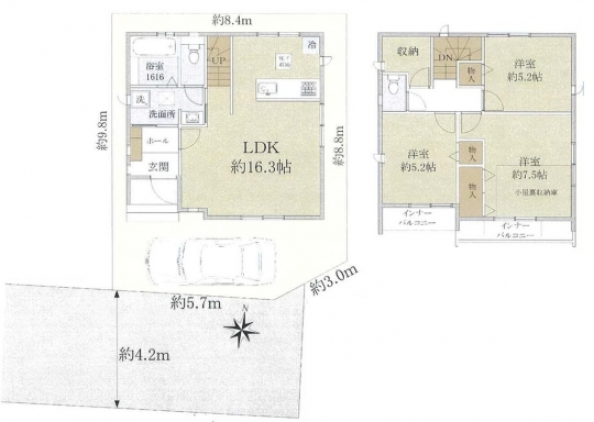 ゆったりとした2階建て3LDK+Sの間取りに駐車スペースも付いています。また、水回りが1階に集中していますので家事動線もスムーズです。