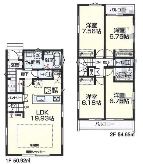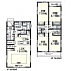 大型2階建て4LDKの間取りには収納も多く魅力的です。また、全居室6帖以上ありますよ。1階リビングに水回りが集中していますので家事動線もスムーズです。