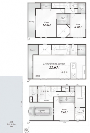 ゆったりとした3階建て3LDKの間取りにはたっぷりの収納がついています。また、各階に吹き抜けを設けているので開放感溢れる空間になっています。