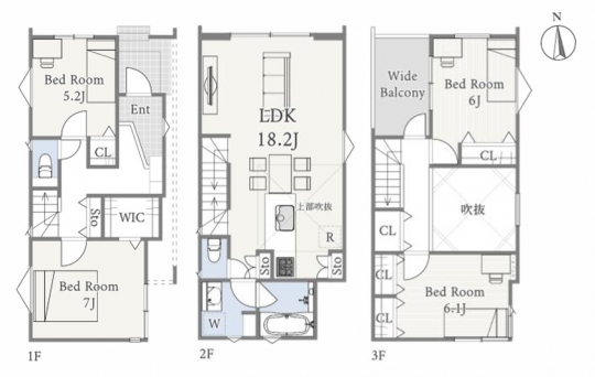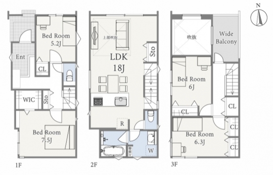 ゆったりとした3階建て4LDKの間取りで水回りがリビング階に集中していますので家事動線もスムーズです。