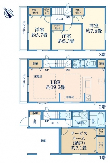 ゆったりとした3階建て4LDKの間取りには床暖房や食洗器など充実の仕様設備が整っています。