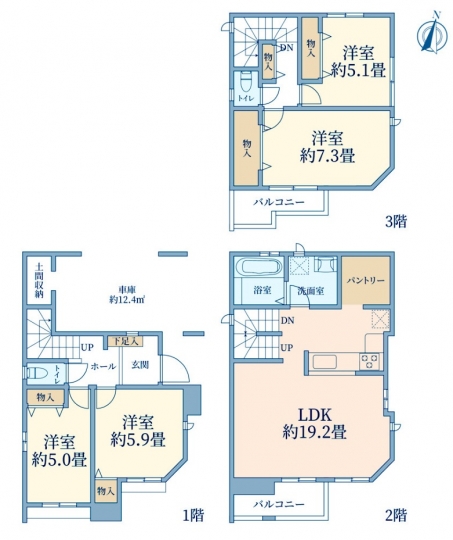 ゆったりとした3階建て4LDKの間取りで全居室収納が付いています。