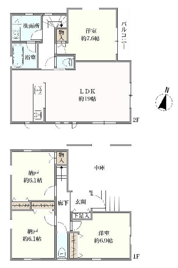 ゆったりとした2階建て4LDKの間取りで全居室6帖以上あり収納も付いています。