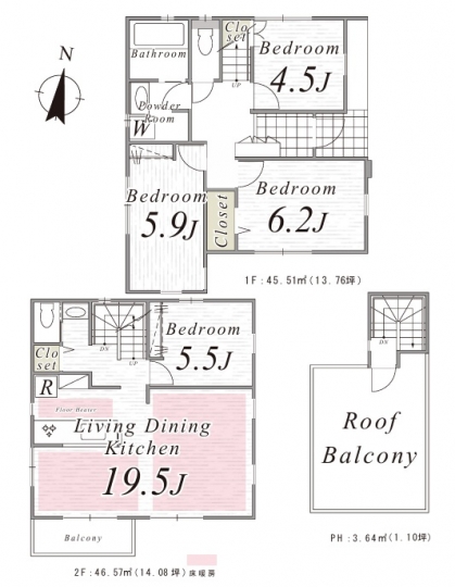 ゆったりとした2階建て4LDKの間取りで人気のルーフバルコニーも付いています。