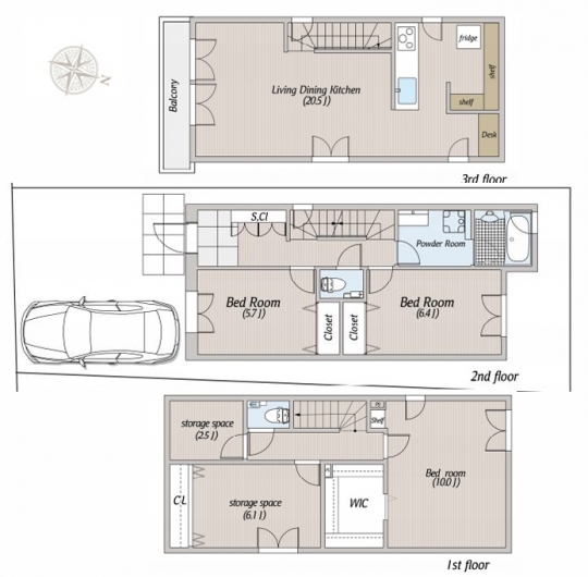 大型3階建て4LDKの間取りには豊富な収納も付いています。